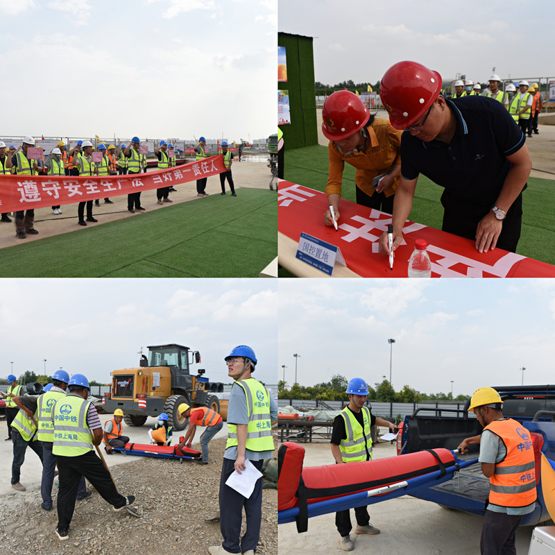 本次演練共設(shè)置基坑坍塌、消防安全、防汛救災(zāi)應(yīng)急演練3個(gè)項(xiàng)目,按照險(xiǎn)情發(fā)現(xiàn)和上報(bào)、險(xiǎn)情搶救、人員救治、險(xiǎn)情解除等環(huán)節(jié)進(jìn)行,分設(shè)后勤保障組、搶險(xiǎn)救援組、醫(yī)療救護(hù)組、警戒保衛(wèi)組、疏散引導(dǎo)組等五個(gè)專(zhuān)業(yè)組。下午15:00,演練拉開(kāi)序幕,全體人員進(jìn)行了安全宣誓,并在橫幅上鄭重簽下自己的名字。隨后,情景模擬依次展開(kāi)。
