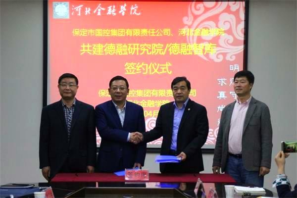 最后保定市國控集團總經(jīng)理謝鵬、河北金融學院副校長韓景旺簽訂“德融研究院/德融智庫”合作協(xié)議,由國控集團董事長陳樹存、河北金融學院校長見簽。隨后雙方根據(jù)現(xiàn)有的實際問題展開座談。